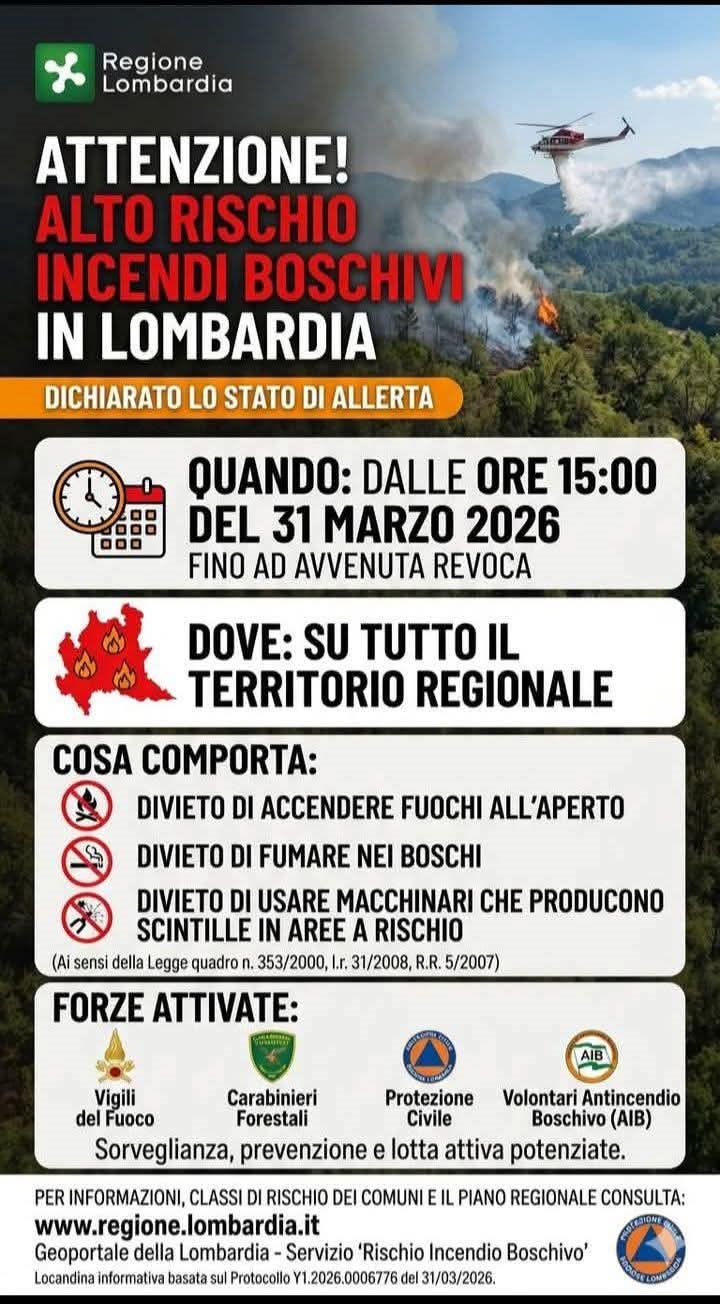 Dichiarato lo stato di alto richio di incenvio boschivo su tutto il territorio regionale, dalle ore 15:00 del 31 marzo 2026, sino ad avvenuta revoca.